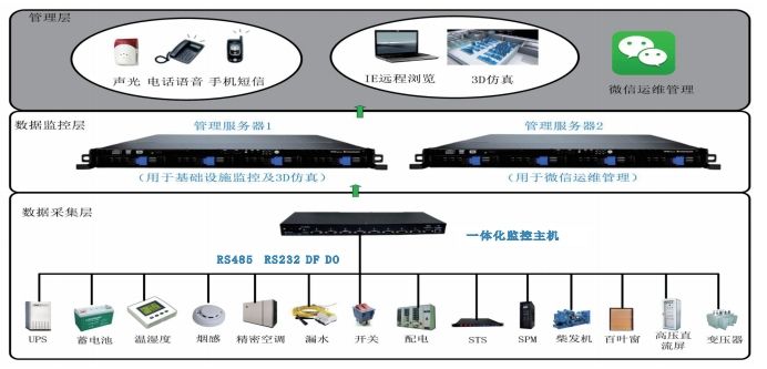動力環境監控系統主要針對各種通信用機房的設備特點和工作環境,對機房內的電源、蓄電池組、UPS、發電機、空調等智能、非智能設備以及溫濕度、煙霧、漏水、門禁等環境量實現“遙測、遙信、遙控、遙調”等功能。 動力環境監控系統充分利用了機房內傳輸設備所能提供的各種傳輸信道資源,實現機房內各項告警和數據快速有效的上傳,同時由監控中心軟件進行圖形化人機界面展示,可對所有機房的全參數、全方位的監控,智能化短信外呼報警,實時事件記錄,提高用戶的維護管理效率,實現機房可靠的科學管理。